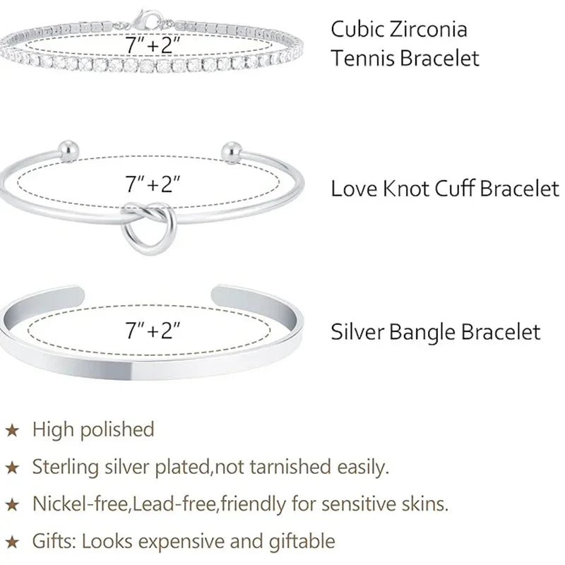 3pcs Stainless Steel Stack Cuff Bracelets for Women 14K Silver Plated Adjustable Jewelry Gifts Luxury CZ Chain Love Knot Bangles